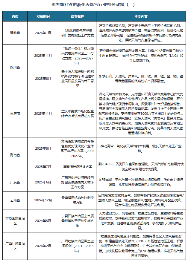 我国各省市也积极响应国家政策规划,对各省市液化天然气行业的发展做出了具体规划,支持当地液化天然气行业稳定发展,比如四川省发布的《“畅通一条江”航运振兴发展集中攻坚三年行动方案(2025—2027年)》、重庆市发布的《重庆市要素市场化配置综合改革试点行动方案》。